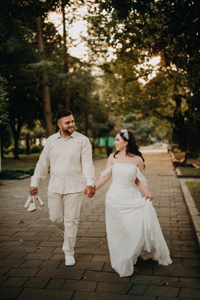 Uzun A kesim beyaz gelinlik, askılı ve straplez yaka detaylarıyla klasik ve minimal bir görünüm sunar. Hafif ve sade kumaştan yapılmıştır.