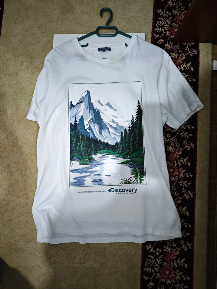 Pamuk kumaştan, baskılı dağ ve orman desenli, yuvarlak yakalı, kısa kollu, rahat kesim beyaz erkek tişörtü.