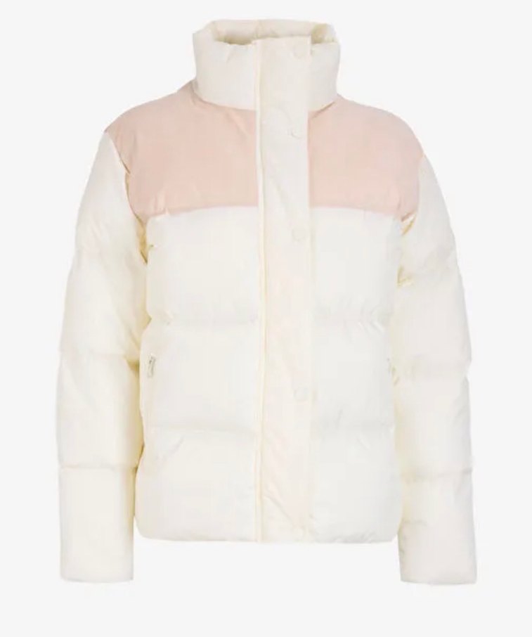 Dıscovery ekru-bej detaylı, yüksek yakalı, uzun kollu ve orta boy rahat kesim kadın kışlık mont. Günlük kullanıma uygun.göğüs 54 cm / boy 66 cm