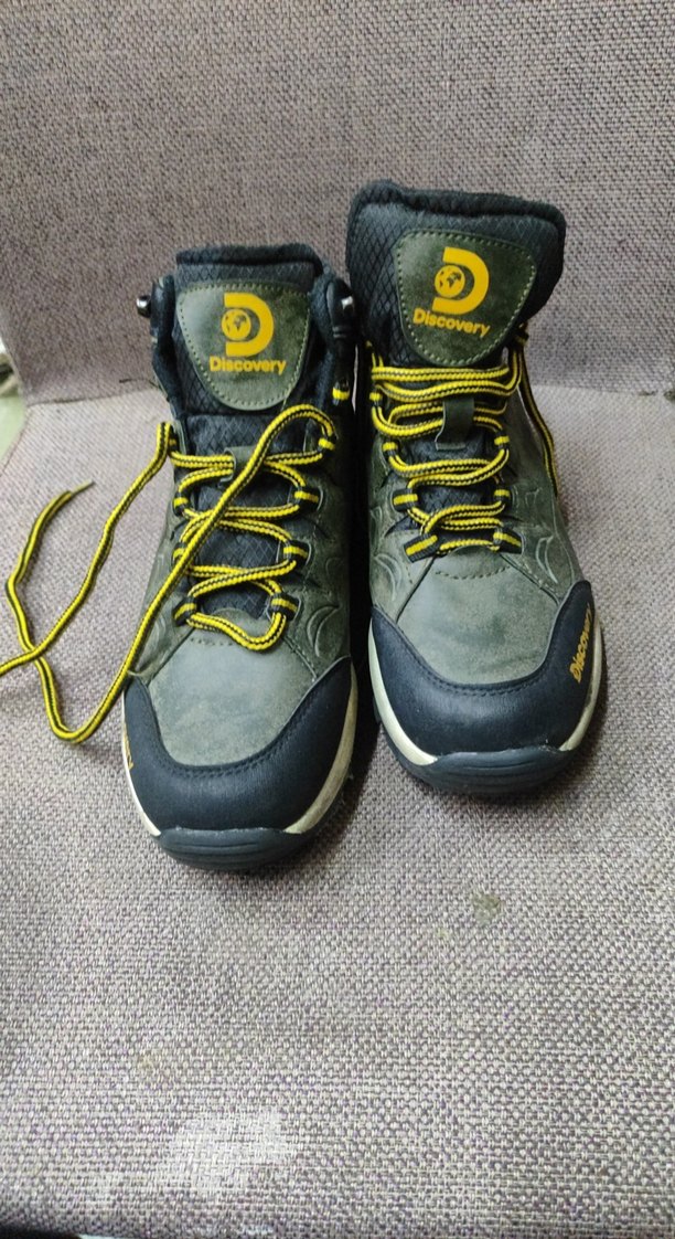 Discovery markalı, gri yılan desenli erkek outdoor ayakkabılar. Kauçuk tabanlı ve cırt cırtlı bağlama özellikli, sokak stili ve athleisure tarzına uygundur.