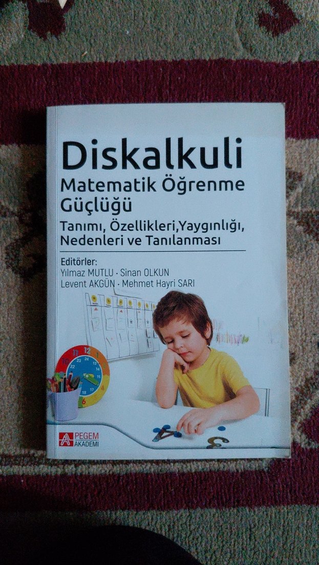 Diskalkuli, matematik öğrenme güçlüğünün tanımı, özellikleri, yaygınlığı, nedenleri ve tanılanmasını içeren bir kitap. Editörler: Yılmaz Mutlu, Sinan Olkun, Levent Akgün, Mehmet Hayri Sarı. sadece önemli yerlerin altı çizildi.
