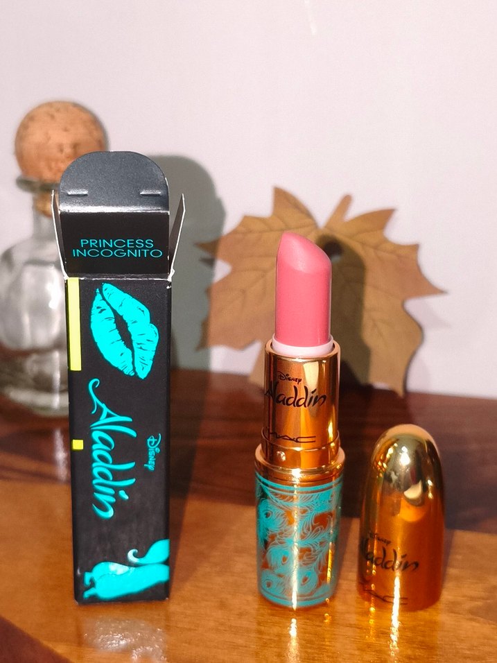 Disney Aladdin koleksiyonundan parlak altın ruj, turkuaz detaylarla süslenmiş. Ambalajda Aladdin logosu ve temalı tasarım bulunur.