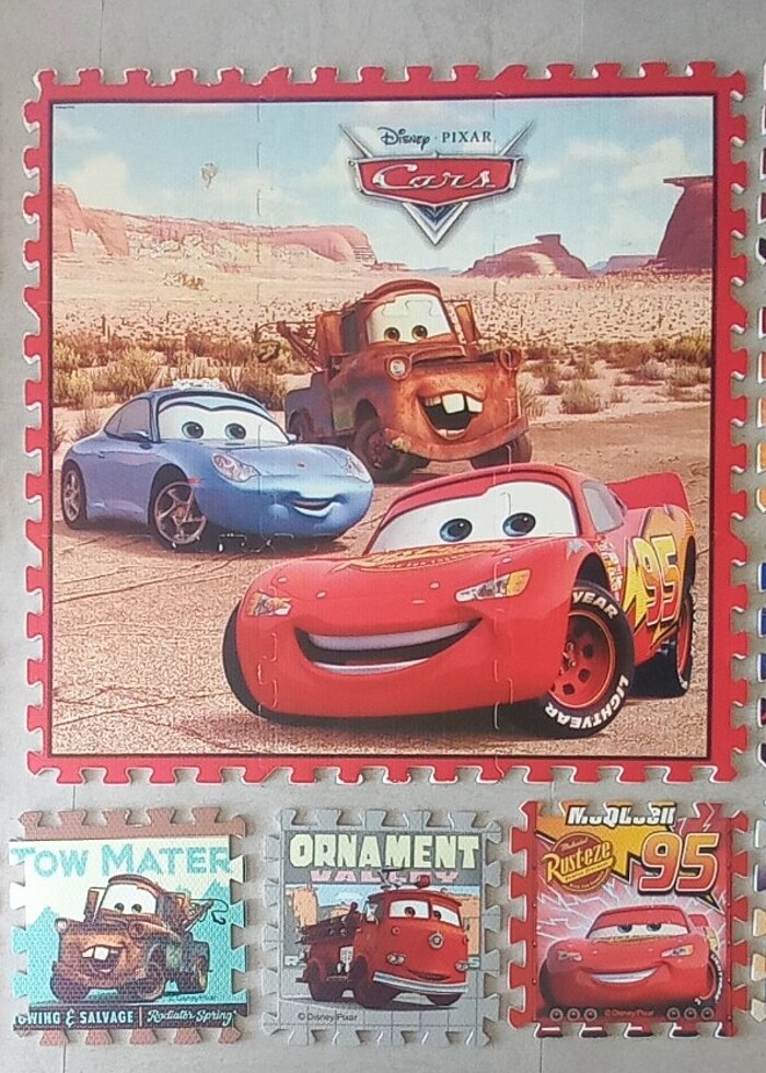 Şimşek McQueen puzzle yer matı. 30cm X 30cm boyutlarında, 10 mm kalınlığında Toplam 36 adet. 9 adetini bir araya getirdiğimiz de fotoğrafta göründüğü gibi ortadaki araba resimi ortaya çıkıyor. Diğer yanlardaki parçalar ise her biri birbirinden bağımsız araba fotoğraflarından oluşmaktadır.