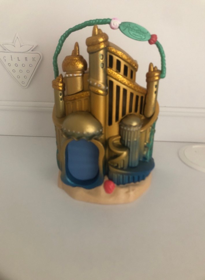 Koyu altın renginde, kubbeli ve kuleli ayrıntılı kale figürü oyuncak, yeşil saplıdır. #disney #disneyland #animator’s #animatör #denizkızı