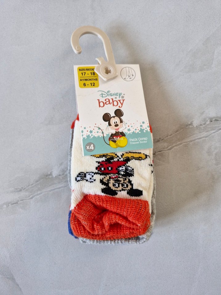 Disney bebek erkek çorapları, renkli desenlerle 4'lü pakette sunulur. Yumuşak kumaşı küçük ayaklar için rahatlık sağlar.