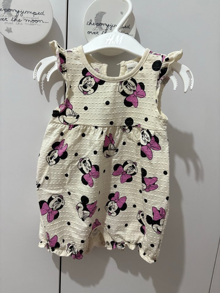 Beyaz, pastel Minnie Mouse baskılı bebek kız tulumu, omuzlarda fırfır detaylı. Yumuşak dokulu kumaşla rahatlık sağlar.