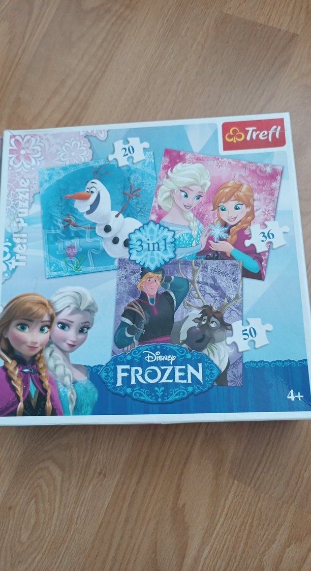 Disney Frozen temalı, 20, 36 ve 50 parçalı üç yapboz seti. 4 yaş ve üzeri çocuklar için uygun, pastel mavi tonlarda.
