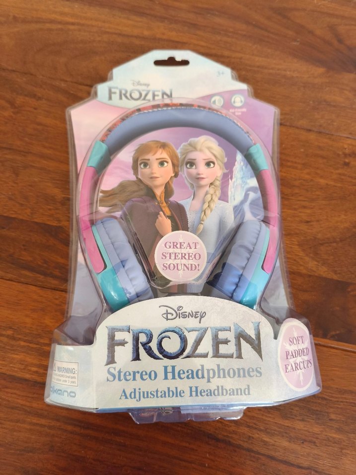 Disney Frozen temalı, ayarlanabilir bantlı ve yumuşak pedli kablolu turkuaz stereo kulaklıklar.