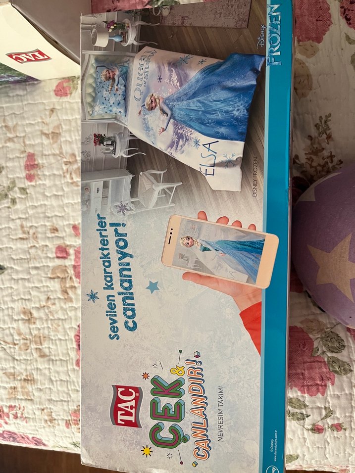 Disney Frozen temalı Elsa baskılı çocuk nevresim takımı, açık mavi tonlarında. Plastik malzemeden üretilmiş yatak çarşafı ve yatak koruyucu içerir. ❄️