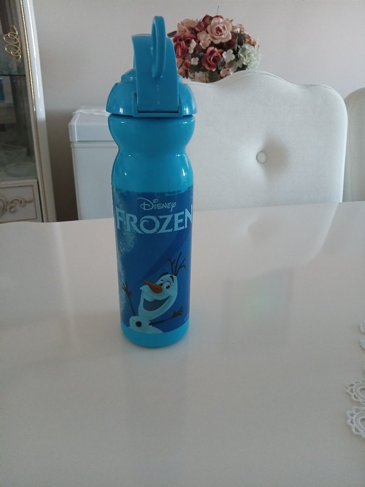 Renkli mavi çocuk su şişesi, Disney Frozen Olaf tasarımıyla. Kolay açılır kapaklı su matarası.