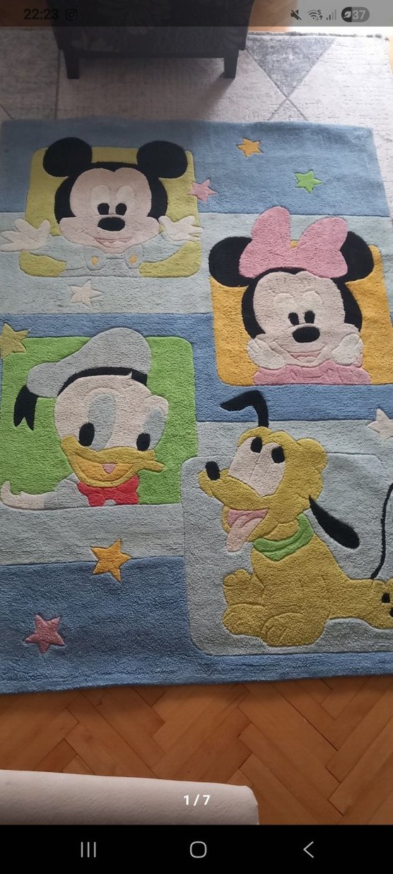Çocuklar için pastel renklerde, Mickey, Minnie, Donald ve Pluto figürlü çok renkli halı. Odaya neşeli bir hava katar. 173×193 ölçülerinde.