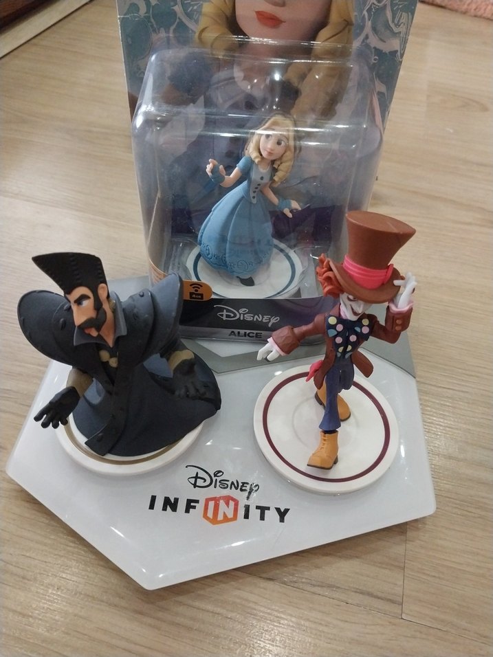 Disney Infinity logosu bulunan taban üzerinde, Alice Harikalar Diyarında temalı üç detaylı ve renkli aksiyon figürü yer alıyor.