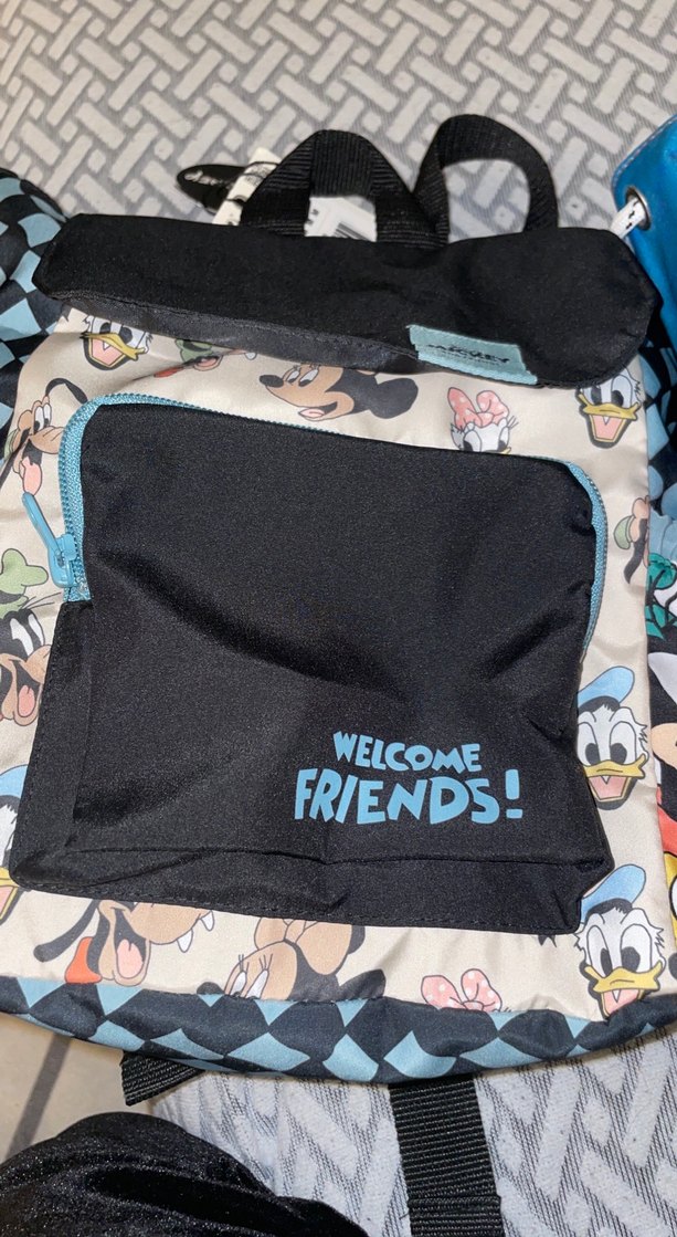 Çok renkli, çizgi karakter desenli çocuk çantası. Ön cepler, mavi saplar ve ayarlanabilir askılar bulunur. Üzerinde 'FRIE' ve 'WELCS' yazıları var. ,2 adet farklı ,adet fiyatı