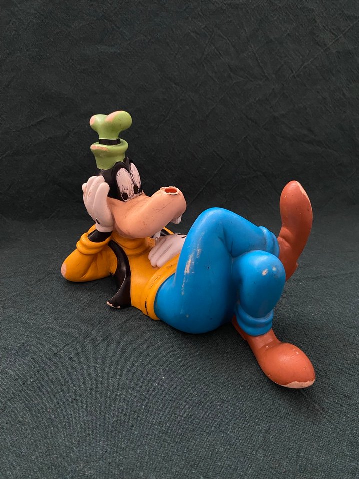 Çok renkli Goofy figürü, başını destekleyen bir koluyla uzanıyor. Canlı koyu tonlar ve klasik karakter detaylarına sahip.