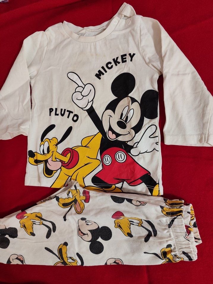 Pamuklu kumaştan yapılmış, Mickey ve Pluto baskılı renkli çocuk pijama takımı. Uzun kollu üst ve lastikli pantolon içerir. Üstte kolay giyim için omuzda düğmeler bulunur. Yakasında minik lekeler var bebeğim artık giymediği için ben ugraşmadım.leke çıkarıcı ile çıkacağız. 9/12 aylık