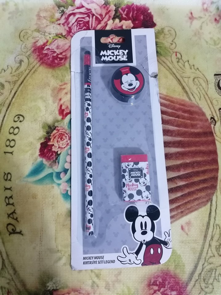 Disney Mickey Mouse tasarımlı kalem, kalemtraş ve silgiden oluşan renkli kırtasiye seti.