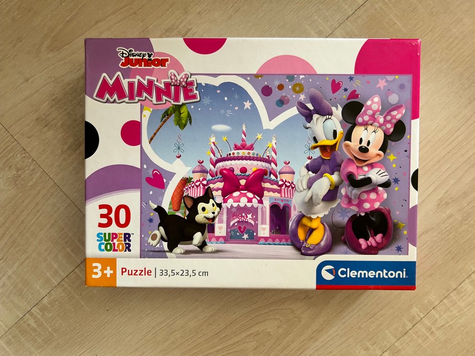 Renkli Disney Minnie temalı 30 parçalık yapboz. Boyutları 33,5x23,5 cm, canlı bir sahne içerir.