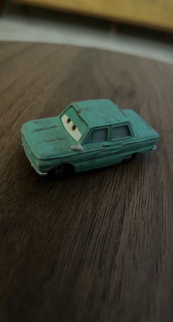Pastel turkuaz renkte oyuncak araba, ön camında ifadeli gözlerle çizgi film karakterini andırıyor. Mat yüzeyi ve hafif eskimiş detayları var.