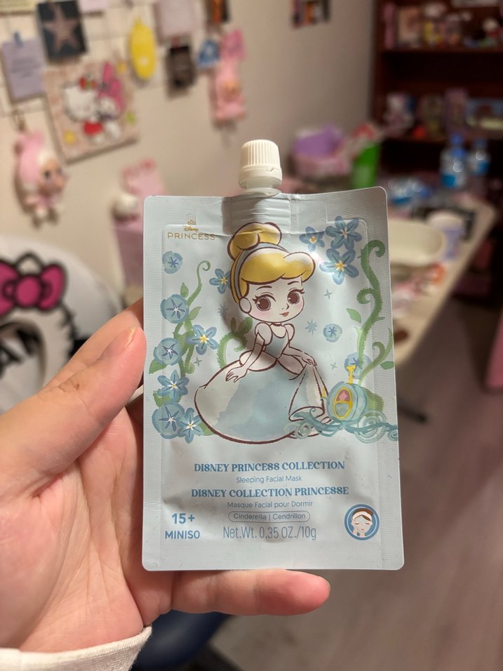 Miniso Disney Prenses Koleksiyonu'ndan 10g'lık uyku yüz maskesi, cildi gece boyunca nemlendirir ve bakım yapar. Hiç kullanmadım.