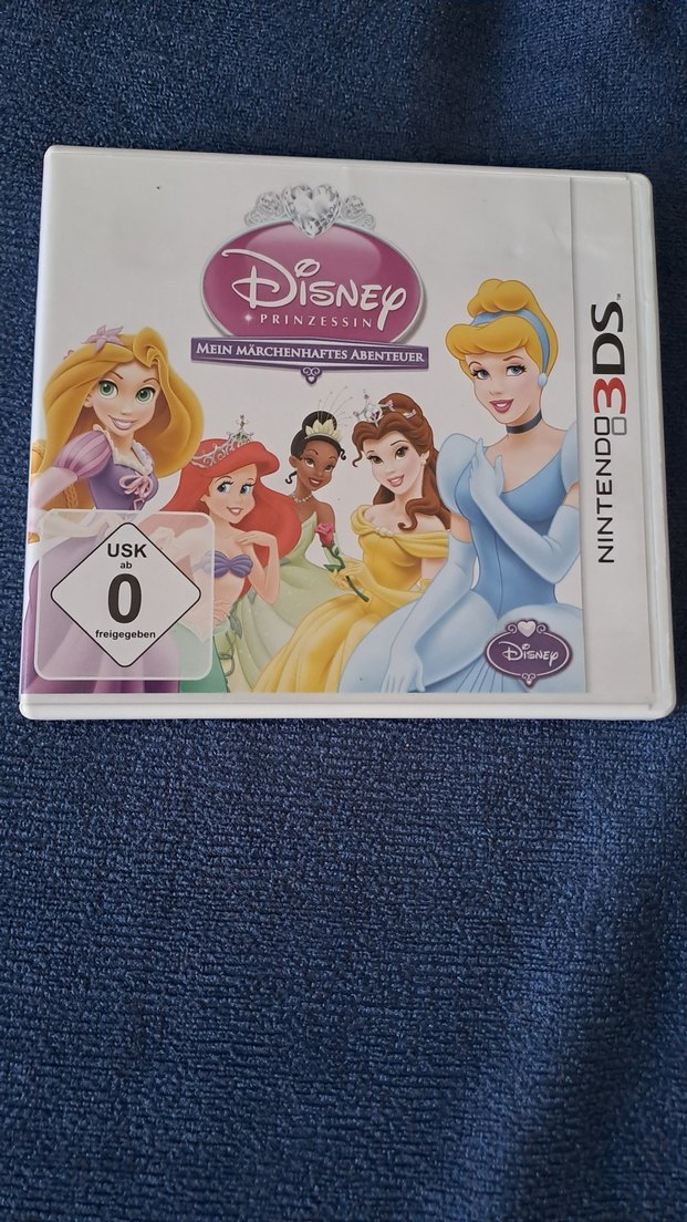 Disney prenseslerinin yer aldığı Nintendo 3DS oyunu, parlak beyaz kutuda. Başlık "Mein Märchenhaftes Abenteuer" yazıyor.