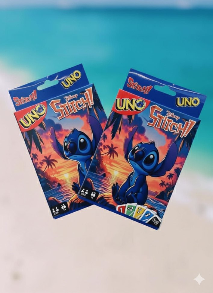 Disney Stitch temalı UNO kart oyunu, canlı mavi kartları ve tropik günbatımı tasarımıyla klasik UNO deneyimini sunar. ✨