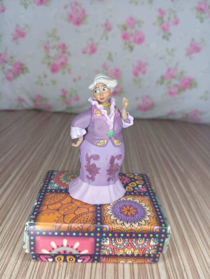 Beyaz saçlı kadın figürü, pastel mor kıyafetleri ve çiçek desenleriyle renkli desenli bir platform üzerinde duruyor. Ürün fotoğraflarda gördüğünüz gibi gönderilecektir detaylar için iletişime geçiniz diğer ürünlerimiz için sayfamızı ziyaret etmeyi unutmayın ☺️