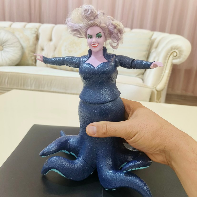 Marka: Disney / Mattel Karakter: Ursula (The Little Mermaid Live Action serisi) prenses kötü deniz cadısı Durum: Çok temiz, kollari eklemleri hareket eder dinamik pozlar için uygundur. Özellikler: Alt kısmındaki vantuz detayları ve yüz hattı çok gerçekçidir. Saçları yapılıdır. Alt kısmında orijinal Mattel damgası ve seri numarası (HLX12) mevcuttur. Koleksiyonumun bir parçasıydı, yeni sahibini bekliyor.