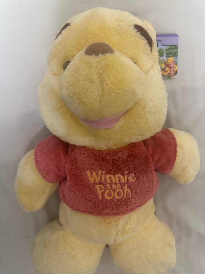 Kırmızı tişörtünde "Winnie the Pooh" yazılı, yumuşak ve renkli sarı peluş oyuncak.