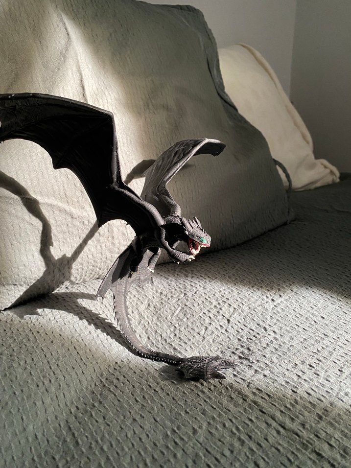 Siyah renkte, detaylı kanatlara ve açık ağıza sahip korkutucu görünümlü ejderha aksiyon figürü. 3D yazıcıda basımı sağlanıp, akrilik boya ile renklendirilmiştir. Ejderhanı Nasıl Eğitirsin? Aslı seride bulunan “Dişsiz” karakteri figürü.