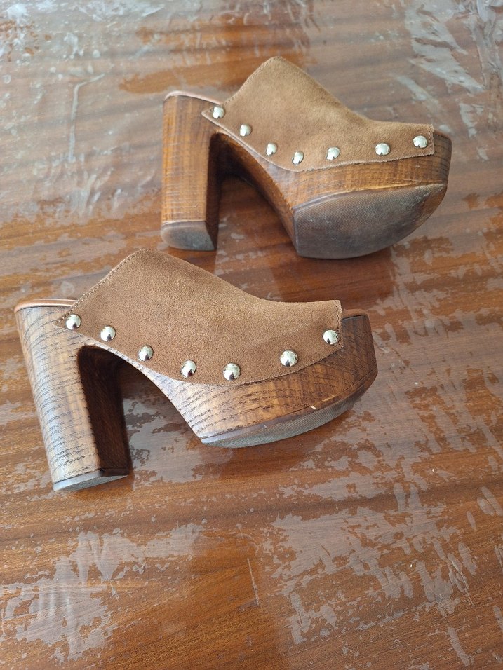 Divarese marka, 37 ni. Kahverengi süet platform topuklu, tokalı ve perçin detaylı, vintage bohem tarzını yansıtan günlük kullanıma uygun terlik. tek bir kere giyildi. italyan malı. tamamen gerçek deri