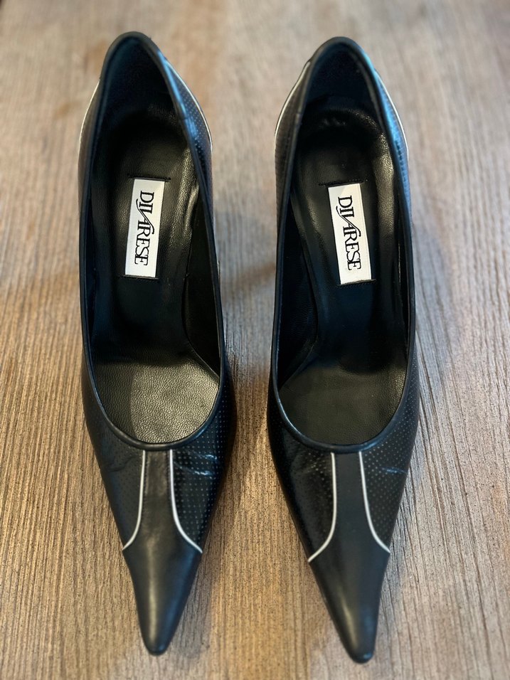 DİVARESE marka, sivri burunlu, desensiz siyah stiletto topuklu kadın ayakkabısı, ofis için şık ve zarif bir seçim. Çok temiz kullanıldı