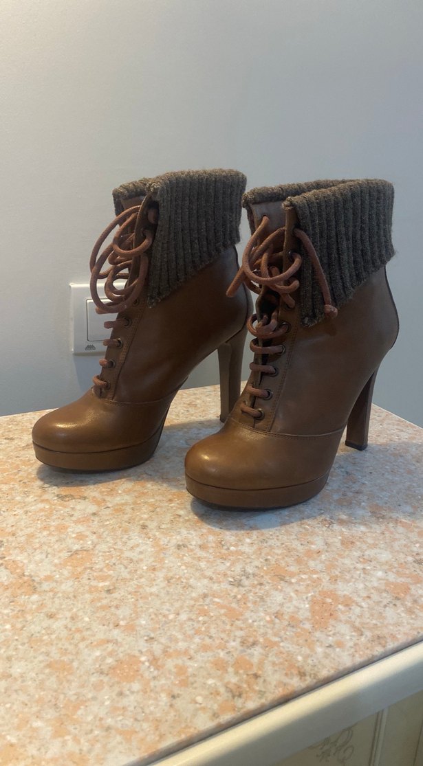 Kahverengi deri platform topuklu kadın botları, örgü detaylı manşetleriyle rahat ve çağdaş bir stil sunar. Desensiz, romantik bir gece için uygun, trend görünümlü.3-4 kez giyilmiştir.