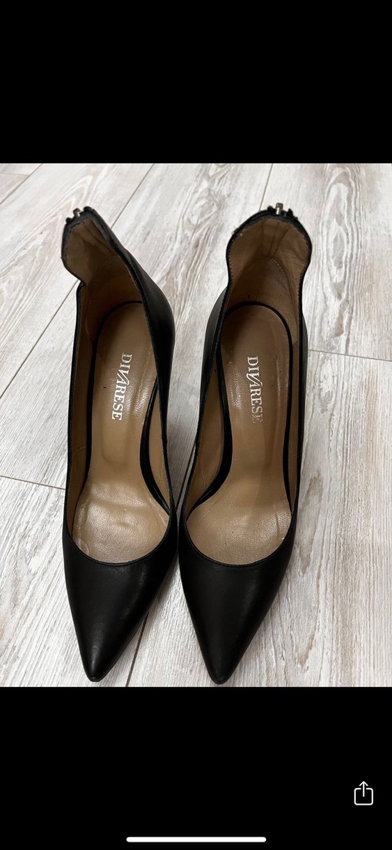 Divarese marka siyah deri stiletto, klasik ve goth tarzını ofis şıklığıyla birleştirir. Desensiz ve koyu renklidir.
