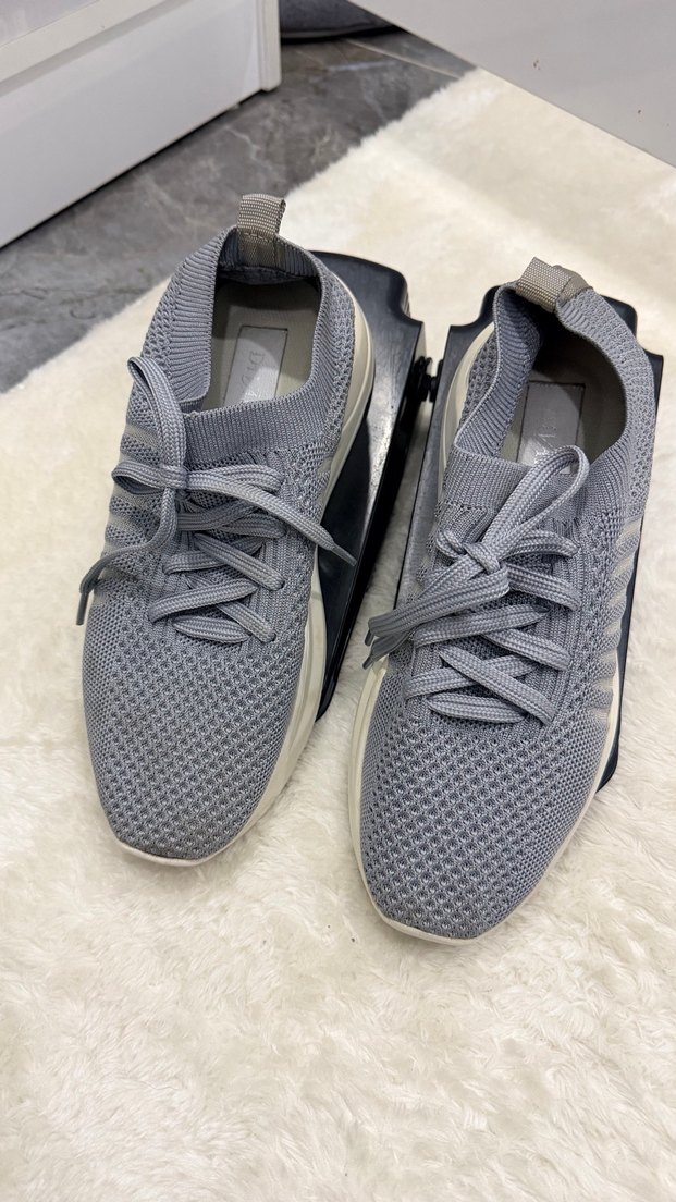 Gri bağcıklı kadın sneakers, yumuşak örme üst kısmı ve kauçuk tabanıyla trend sokak stili için uygun. ♀️