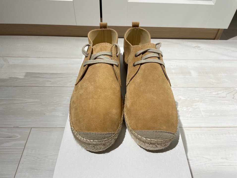Taba süet erkek espadril ayakkabı, dokuma tabanlı ve günlük kullanıma uygun normcore tarzda.