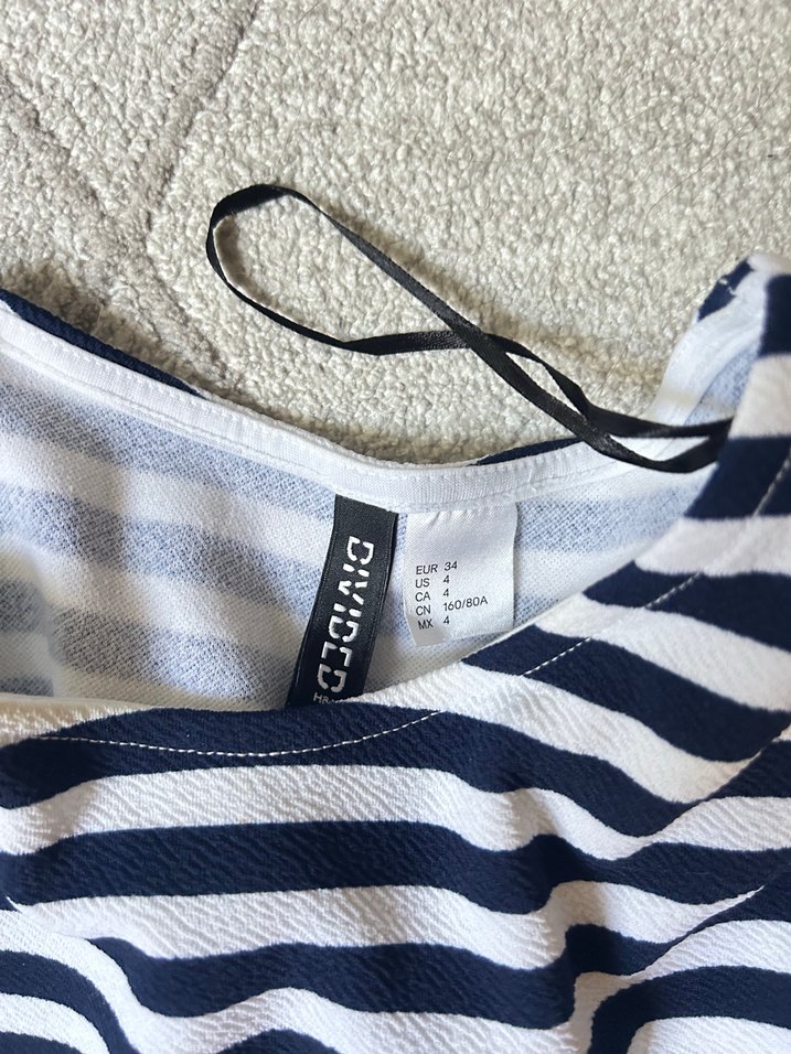 Divided markalı, mavi ve gri çizgili hamile bluzu, kayık yaka ve düğmeli detaylara sahip. Salaş kesimi ve askılı kollarıyla günlük kullanıma uygundur.