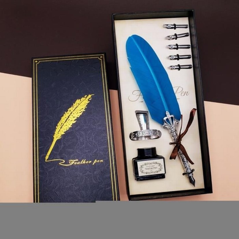 Divit Kalem Seti Mavi 00358## Mavi tüy kalem seti, mürekkep, beş farklı uç ve yüzük tutucu içerir. Marka adı "Wealhorp" bulunur. ️