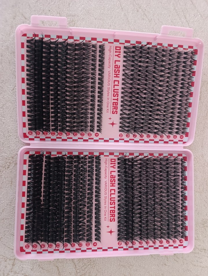 Koyu tonlarda, kişiselleştirilebilir kirpik kümeleri içeren pembe kutuda DIY lash clusters seti. Ambalajda "DIY LaSH CLUSTERS" yazmaktadır.
