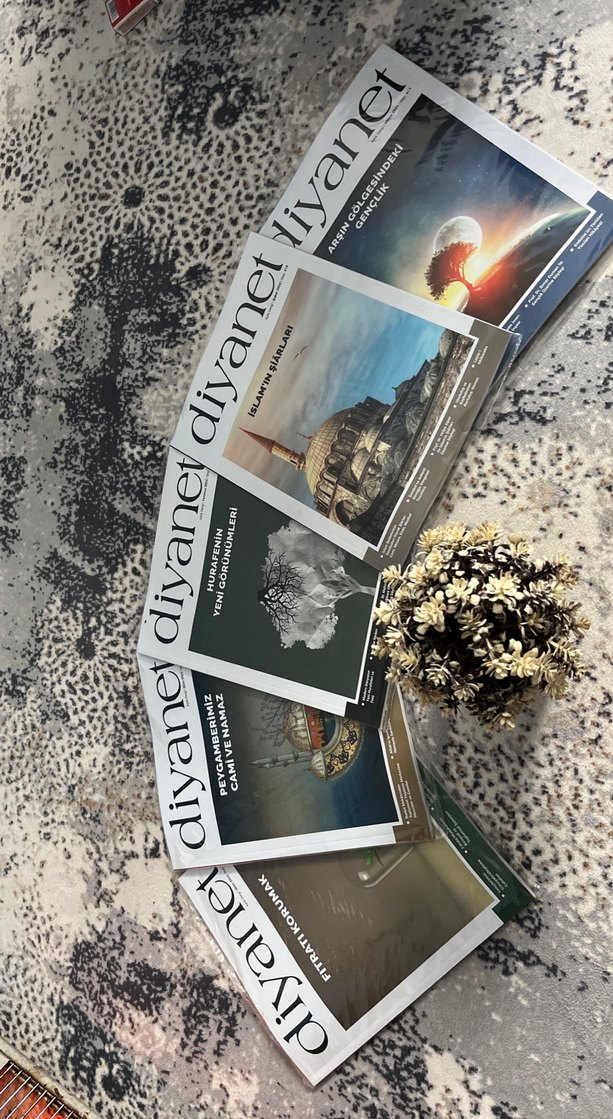 Çeşitli kültürel ve dini konuları içeren Diyanet dergileri, desenli zeminde ve dekoratif çiçekle birlikte sergileniyor.