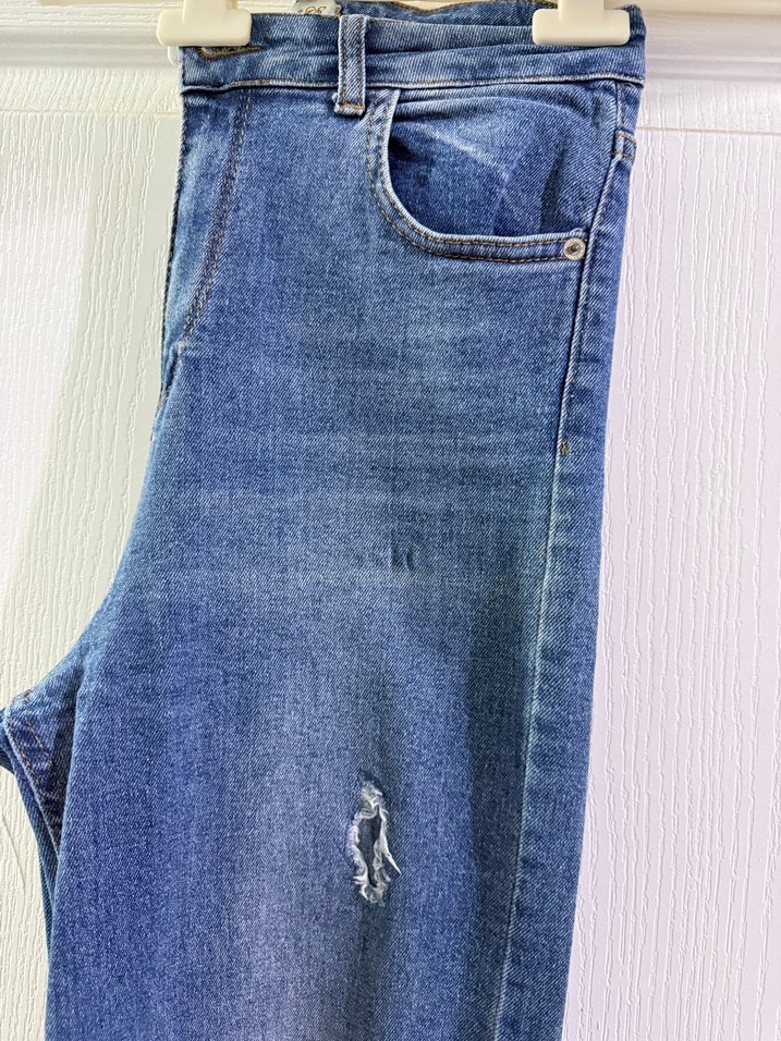 Diz Altı Yırtık Detaylı Mavi Kadın Jean