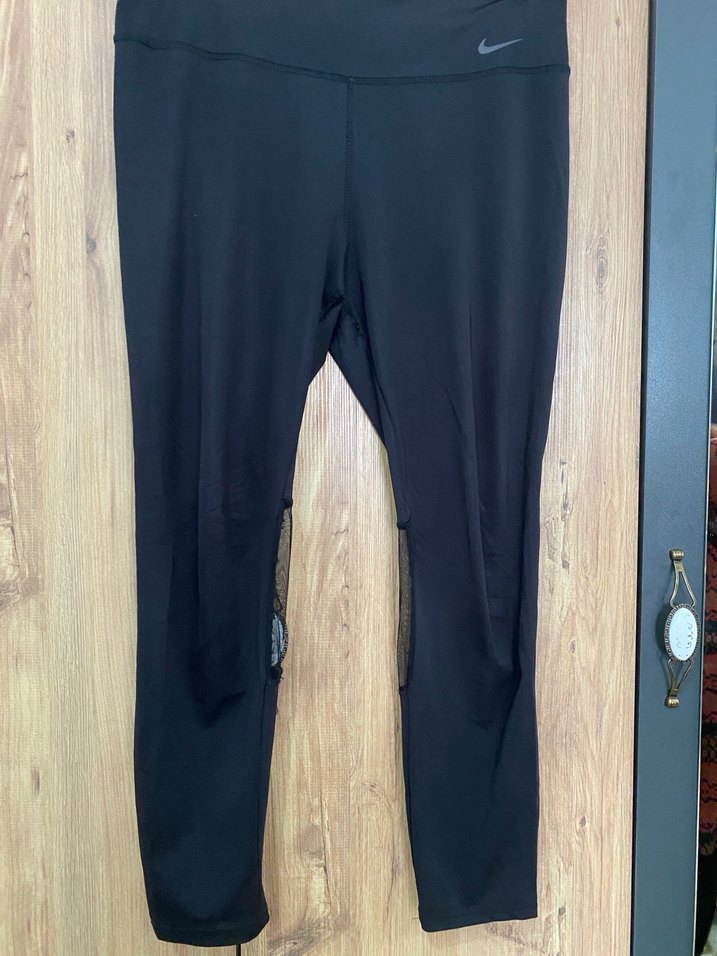 Kadınlar için siyah, diz altı boyda, yırtmaç detaylı ve sentetik kumaştan yapılmış spor tayt. Nike logosu bel kısmında yer alır.