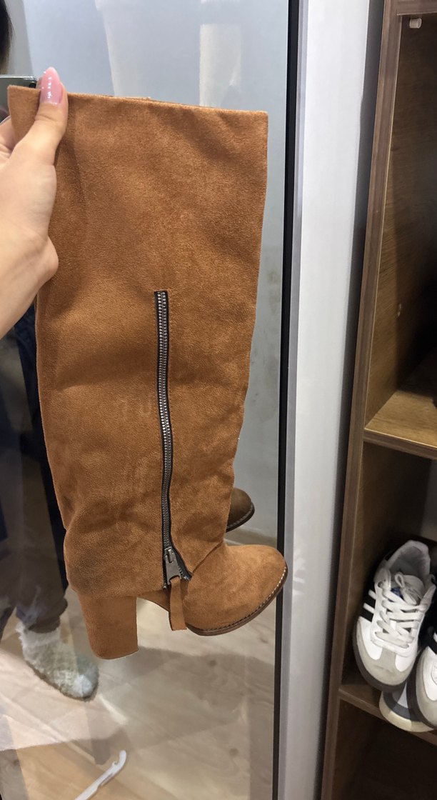 Kahverengi tozluklu süet diz boyu çizme, stiletto topuklu ve fermuarlı. Trendy rahat sokak stili için uygun, günlük kullanım için ideal.