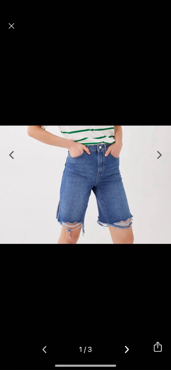 Yırtık detaylı, bol kesim mavi denim şort, rahat sokak stili ve günlük kullanıma uygun.