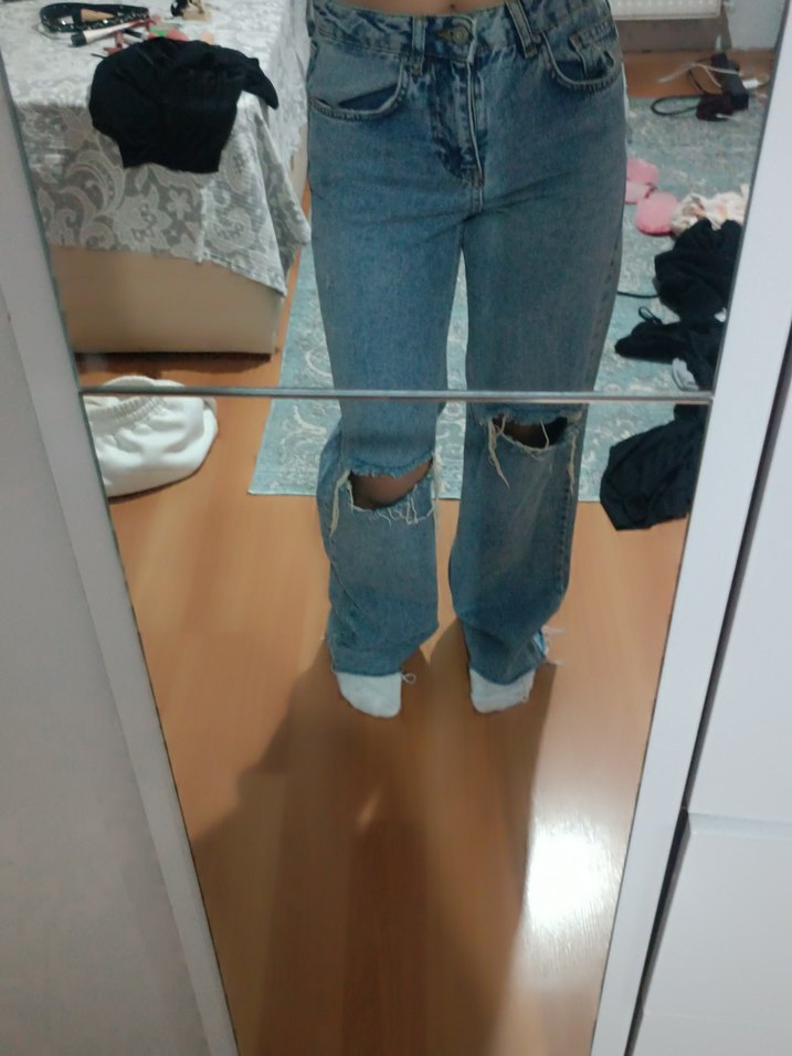 Diz yırtıklı, tokalı, bol kesim mavi kot pantolon. Rahat ve trend bir görünüm sunar, günlük sokak stiline uygundur.