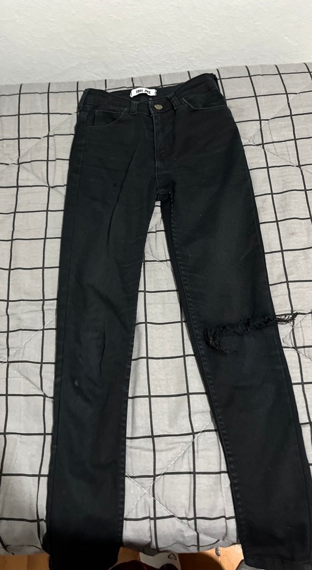 Diz yırtıklı, midi boy, regular fit siyah denim kadın jean. Grunge punk tarzına uygun, günlük kullanıma uygun rahat bir model.