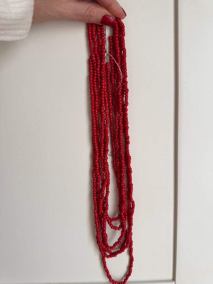 Bir dizi kırmızı boncuk. Dikiş hobi el işi işleri için uygun