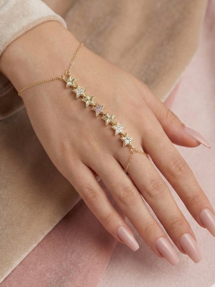 Altın renkli, boncuklu yıldız detaylı ve işleme desenli bohem tarzda kadın el zinciri, düğünler için uygun. ✨