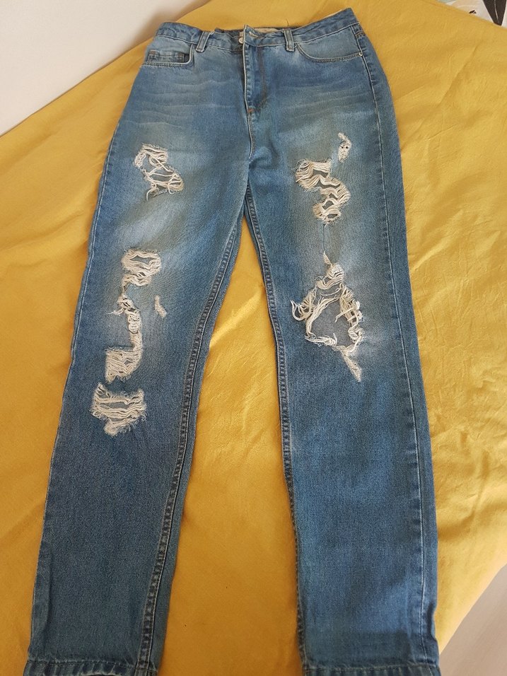 Dizlerde yırtık detayları olan,bol kesim,dar paca,kusuru olmayan genc kiz kot pantolon.uzunluk 100 cm,bel 38 cm dir.Günlük ve sokak stiline uygun.