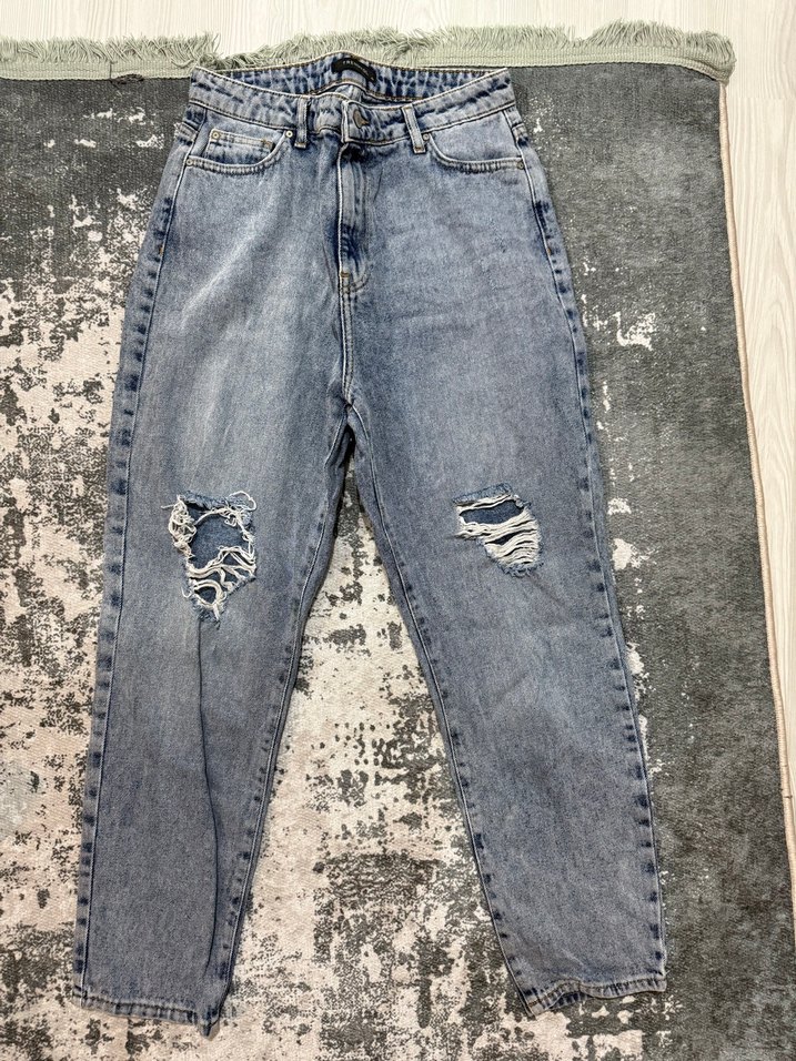 Bol kesim, dizleri yırtık gri kadın kot pantolon. Tokalı ve normal boyda, günlük kullanım için uygundur.