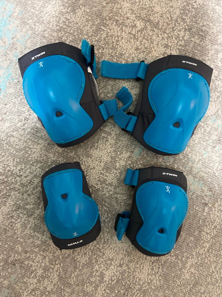 Yumuşak kürk benzeri kumaş ve Velcro bantlarla sabitlenen koyu mavi biker tarzı diz ve dirsek pedleri. Decathlondan alinmisti. 2 kez kullanildi.